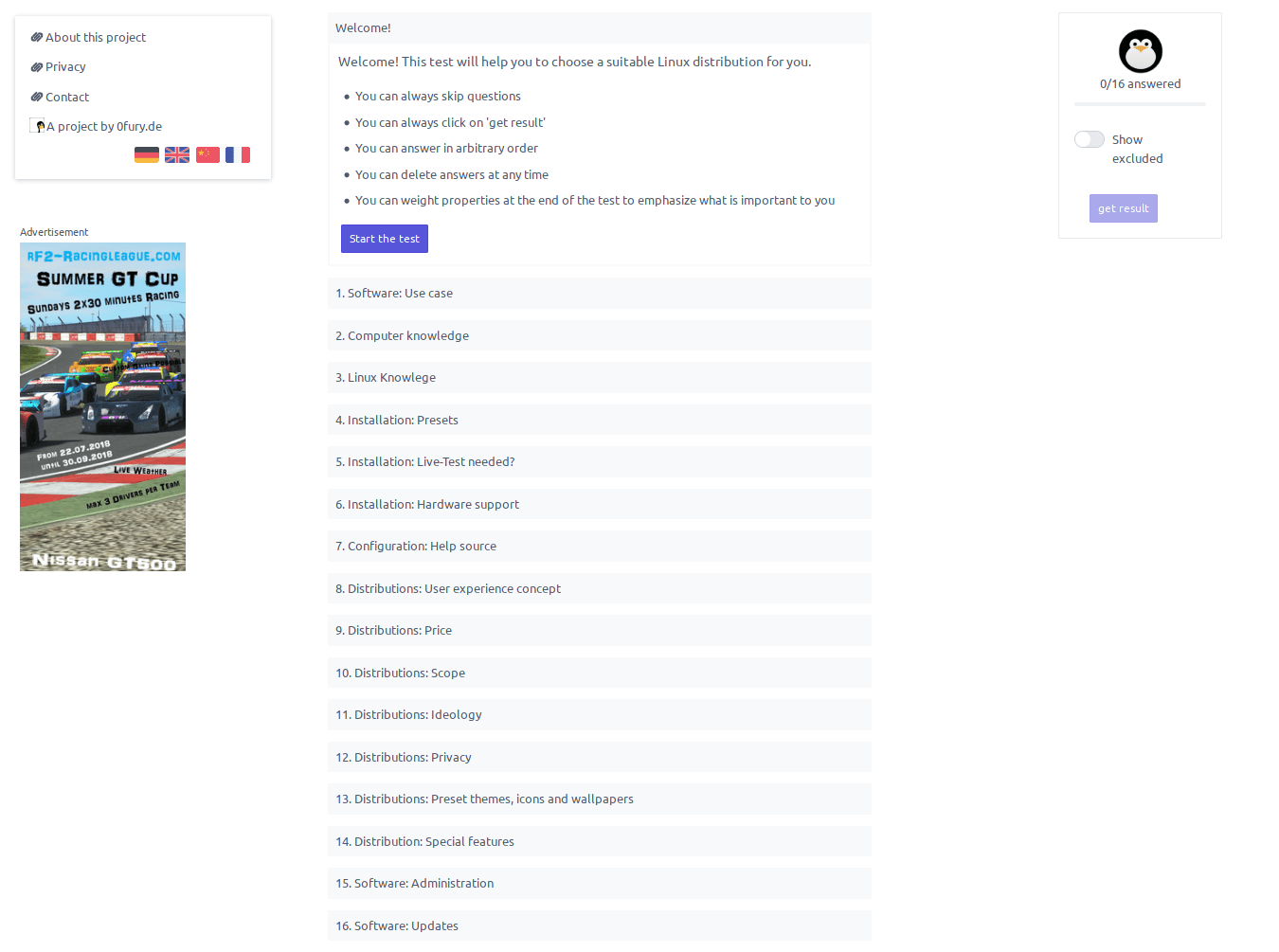 你将被重定向到 Distrochooser 主页,其中有一个小测试在等待你注册。