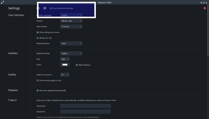 始终启用高级设置。它给了你更多的选项去调整 Popcorn Time 点击右上角的齿轮标记。查看其中的高级设置。