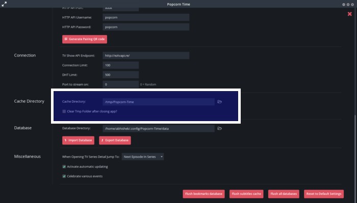 在高级设置里面,向下滚动一点。找到缓存目录,你可以把它更改到其他像是 Downloads 目录,这下你即便关闭了 Popcorn Time,这些文件依旧可以观看。