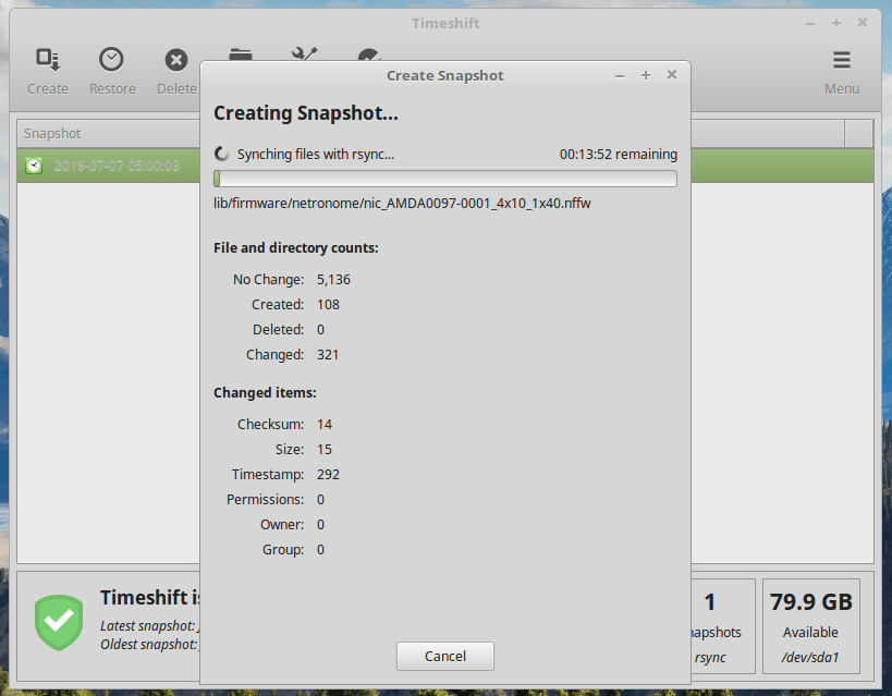 Timeshift 能够通过增量快照来保护用户的系统数据,而且可以按照日期恢复指定的快照,类似于 Mac OS 中的 Time Machine 功能和 Windows 中的系统还原功能。
