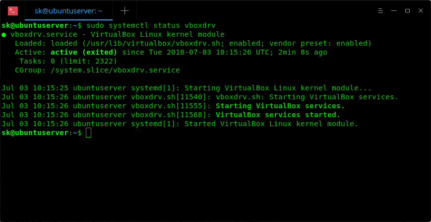 正如你在上面的截屏中所看到的,vboxdrv 模块已加载,并且是已运行的状态!