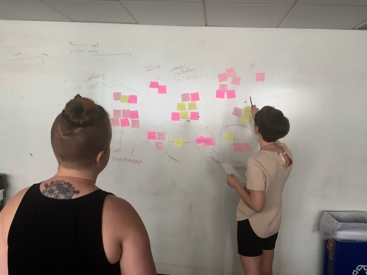 在产生了好几个关于应用的想法时,我们把这些想法分类记录下来,以便更好的理解我们大家都感兴趣的主题。在我们这个小组中,我们看到实现想法的清晰趋势,需要自我改进、设定目标、情怀,还有个人发展。我们最后从中决定了具体的想法:做一个用于设置和管理长期目标的控制面板,有保存记忆的元素,可以根据时间将数据可视化。