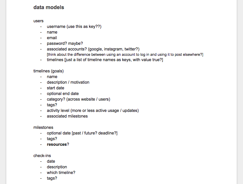 到了设计数据结构的时候。基于我们的示意图和用户故事,我们在 Google doc 中制作了一个清单,它包含我们将会需要的模型和每个模型应该包含的属性。我们知道需要 “目标(goal)” 模型、“用户(user)”模型、“里程碑(milestone)”模型、“记录(checkin)”模型还有最后的“资源(resource)”模型和“上传(upload)”模型,