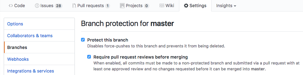 我们知道,从一开始就保持井然有序、执行敏捷开发对我们有极大好处。我们设置好 Github 上的仓库,我们无法直接将代码合并到主(master)分支,这迫使我们互相审阅代码。