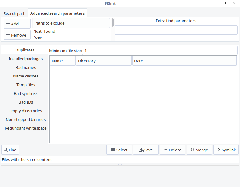 FSlint 是另外一个查找重复文件的工具,有时我用它去掉 Linux 系统中不需要的重复文件并释放磁盘空间。不像另外两个工具,FSlint 有 GUI 和 CLI 两种模式。因此对于新手来说它更友好。FSlint 不仅仅找出重复文件,也找出坏符号链接、坏名字文件、临时文件、坏的用户 ID、空目录和非精简的二进制文件等等。