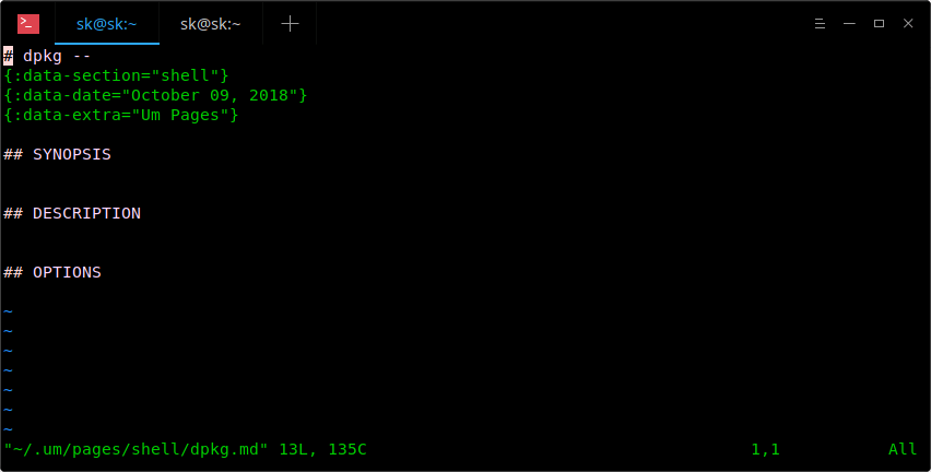 正如你在上图的输出中看到的,我为 dpkg 命令添加了概要,描述和两个参数选项。 你可以在 man 手册中添加你所需要的所有部分。不过你也要确保为每个部分提供了适当且易于理解的标题。 完成后,保存并退出文件(如果使用 Vi 编辑器,请按 ESC 键并键入:wq)。