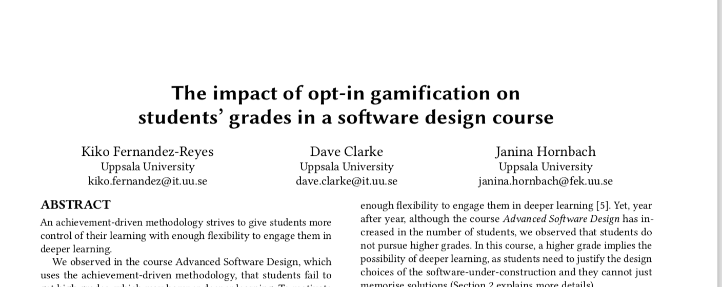 title: The impact of opt-in gamification on `\\`{=latex} students' grades in a software design course