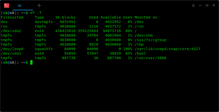 tmpfs tmpfs 788.8M 32K 788.8M 0% /run/user/1000