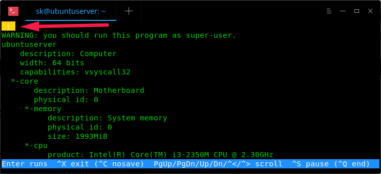 下面给出一个简单的例子介绍 up 的使用方法。如果需要将 lshw 命令的输出传递给 up,只需要在终端中输入以下命令,然后回车: