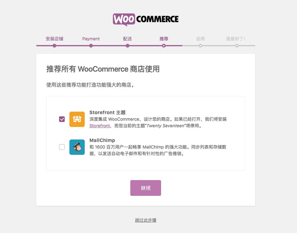 启用插件后, WooCommerce 会引导你进行初始化配置,根据提示对插件进行配置。