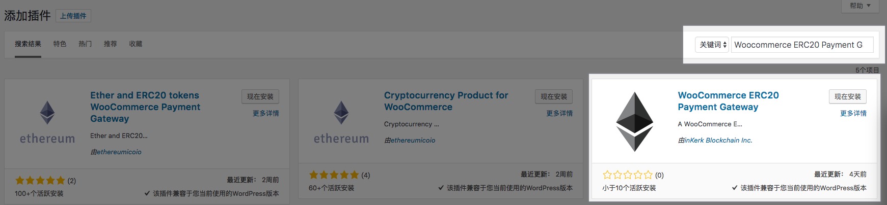 打开“插件”-“安装插件”,在关键词中输入 “Woocommerce Customize ERC20 Currency”并回车。这是我们联合硬核区块链公司开发的一款用于给 WooCommerce 增加 ERC20 货币的插件,该插件已经开源于 GitHub
