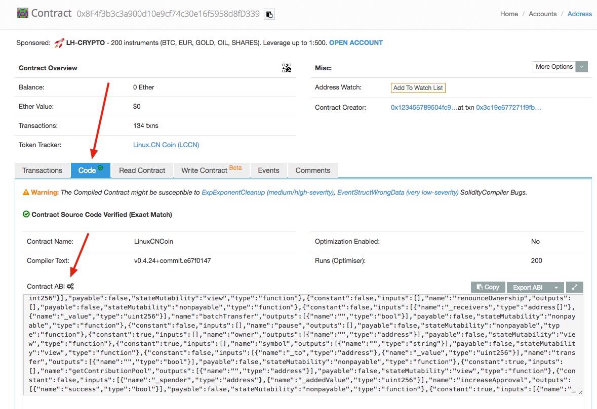 合约 ABI 则可以在 etherscan 中找到,比如,LCCN 的合约地址为:https://etherscan.io/address/0x8f4f3b3c3a900d10e9cf74c30e16f5958d8fd339#code,由于 LCCN 公开了其合约源代码,其 ABI 可以在合约的界面找到(如未公开,请向你的 ERC20 合约开发人员索要 ABI),点击右侧 “Copy”,复制 ABI,并将其填入设置项目中去。