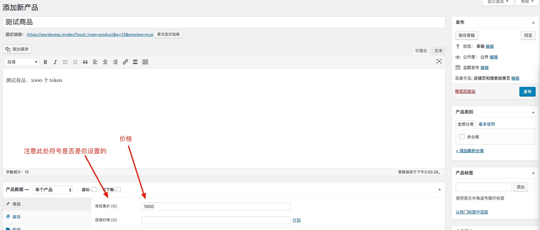 插件设置完成后,我们来新建一个产品,用于测试。点击顶栏中的“新建”-“产品”,进入到创建产品的界面。
