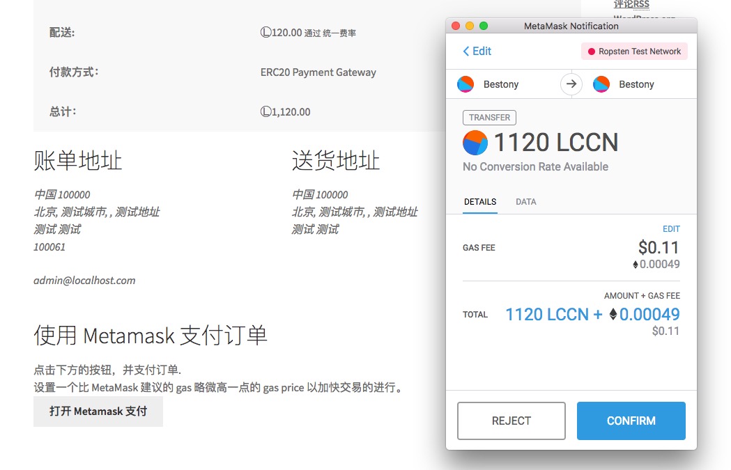 描述会展示在支付方式的下方,同样的,你可以设置为 “使用 LCCN 支付费用”,此外,还建议你在此引导顾客安装、并打开 Metask 插件,切换到主网络,确保后续支付。