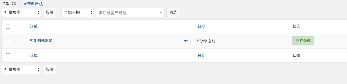 用户支付完成后,如何确定订单已经支付完成了呢?进入后台“仪表盘”-“WooCommerce”-“订单”,可以看到用户所有的订单。