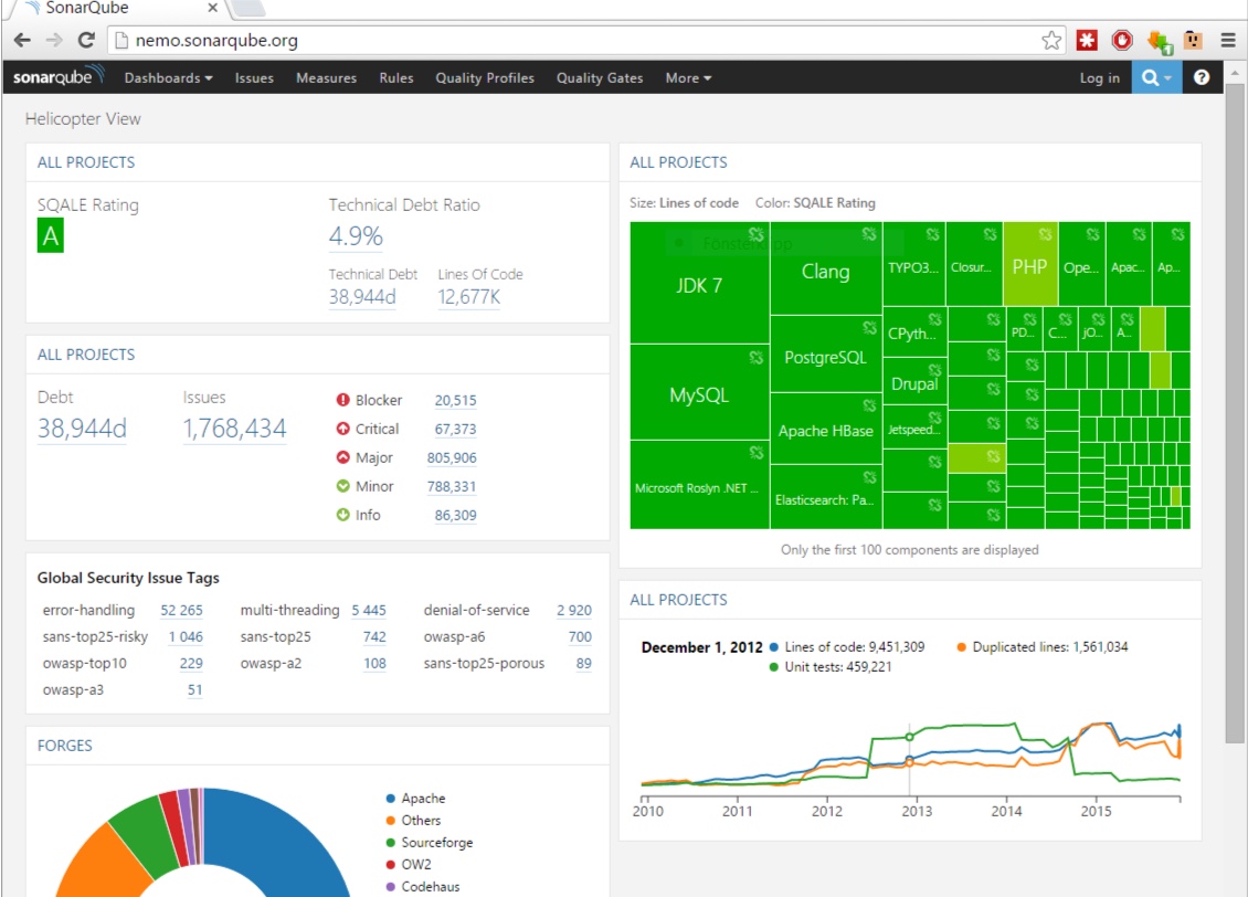 SonarQube 同时也提供了一个可同时维护和管理不同项目、不同代码的集中的环境。可以为每个项目定制规则。持续的检查和分析代码的健康轨迹。