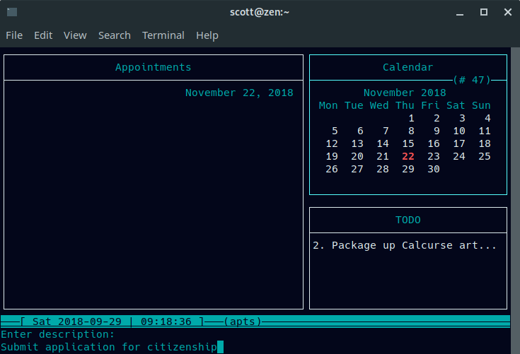 使用 Calcurse 可以轻松地在命令行中进行组织任务。Calcurse 在基于文本的界面里带来了图形化外观。你可以得到简单、结合易用性的命令行和导航。