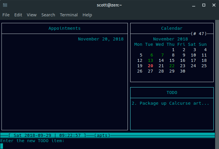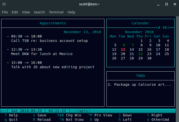 Calcurse 将其信息以文本形式保存在你的主目录下名为 .calcurse 的隐藏文件夹中,例如 /home/scott/.calcurse。如果 Calcurse 停止工作,那也很容易找到你的信息。