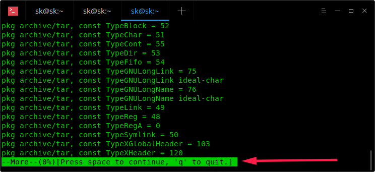 如上图所示,more 会提示你可以按空格键翻页。