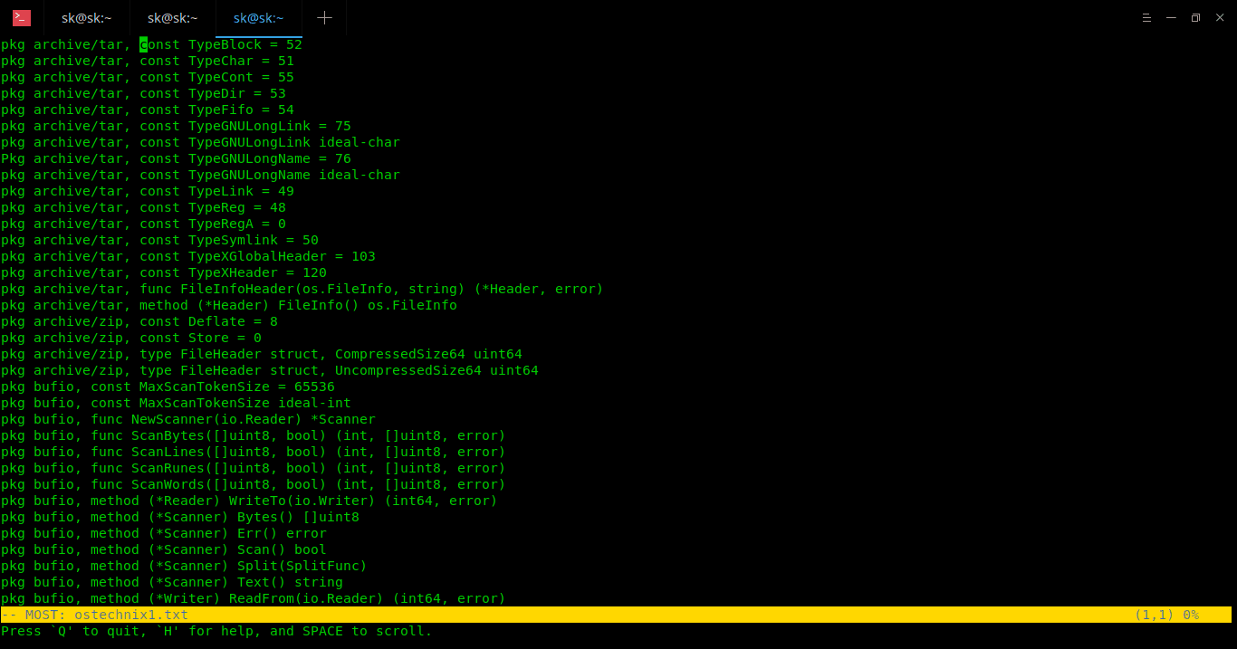 most 同样是一个终端阅读工具,而且比 more 和 less 的功能更为丰富。most 支持同时打开多个文件。你可以在打开的文件之间切换、编辑当前打开的文件、迅速跳转到文件中的某一行、分屏阅读、同时锁定或滚动多个屏幕等等功能。在默认情况下,对于较长的行,most 不会将其截断成多行显示,而是提供了左右滚动功能以在同一行内显示。