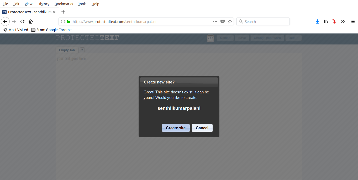 访问 https://www.protectedtext.com/ 这个链接,就可以打开 ProtectedText 页面了(LCTT 译注:如果访问不了,你知道的)。这个时候你将进入网站主页,接下来需要在页面上的输入框输入一个你想用的名称,或者在地址栏后面直接加上想用的名称。这个名称是一个自定义的名称(例如 https://www.protectedtext.com/mysite),是你查看自己保存的笔记的专有入口。