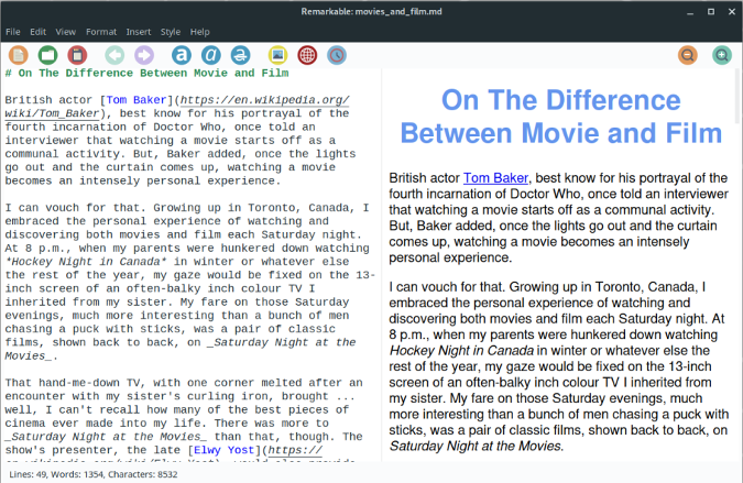 Remarkable 复杂性介乎于 Ghostwriter 和 Abricotine 或 Mark Text 之间。它有一个带点现代风格的双栏界面。它有一些有用的特点。
