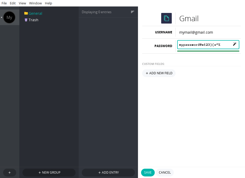 它就像一个保险库,我们将保存不同账户的登录凭证。如你所见,我们并没有添加任何条目。让我们添加一些。