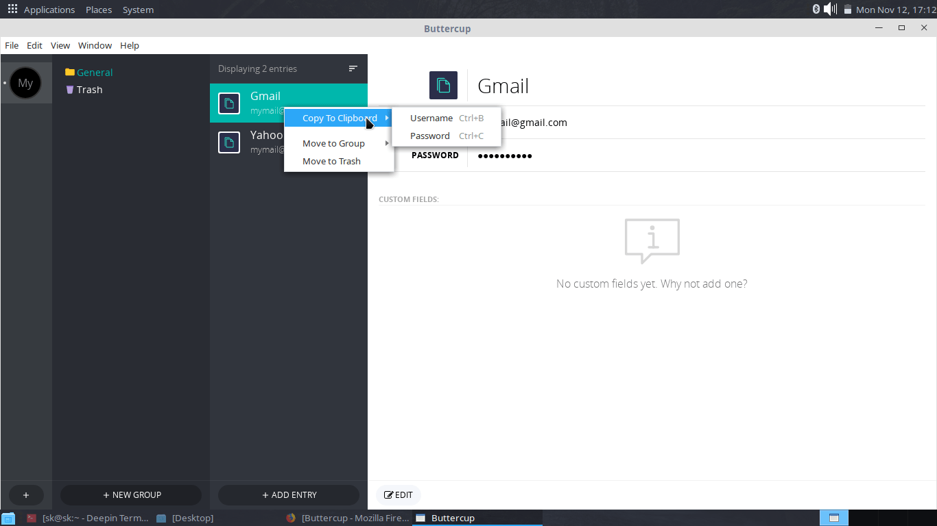 存储在存档中的数据可以随时编辑、移动到其他组或彻底删除。例如,如果要将用户名或密码复制到剪切板,请右击该条目,然后选择 “Copy to Clipboard”。