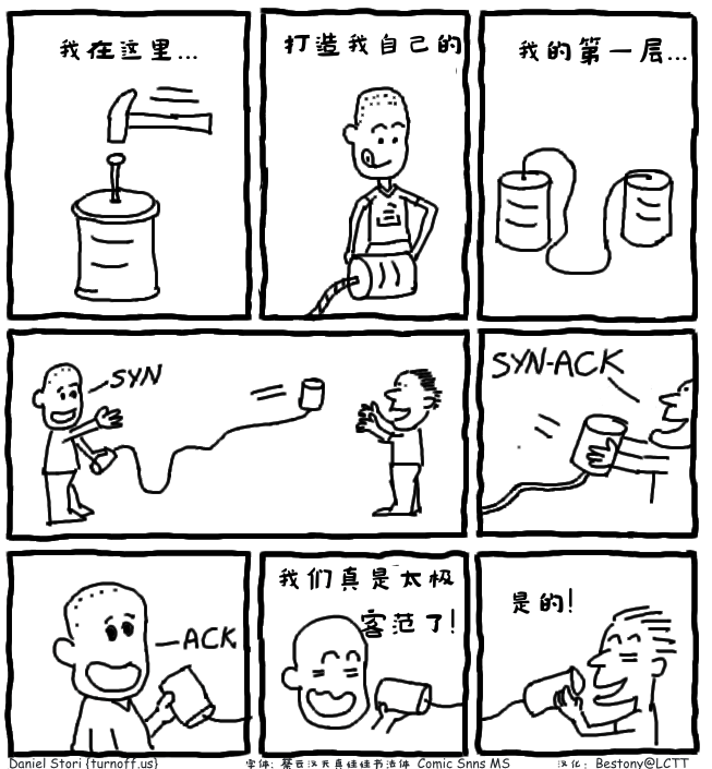 这幅漫画展示了 TCP 协议的沟通过程。首先是构建一个层(TCP 工作于传输层),然后向要通信的人发送建立联系的信号(SYN),接受到信息的人回复确认信息(ACK),确认已经收到,同时,发送建立联系的信息(SYN),这时,它发送的信息就是(SYN-ACK),当最初发送信息的人收到信息后,再回复了确认信息(ACK)。在回复了确认信息后,他们可以正常的交流,就开始说话了。