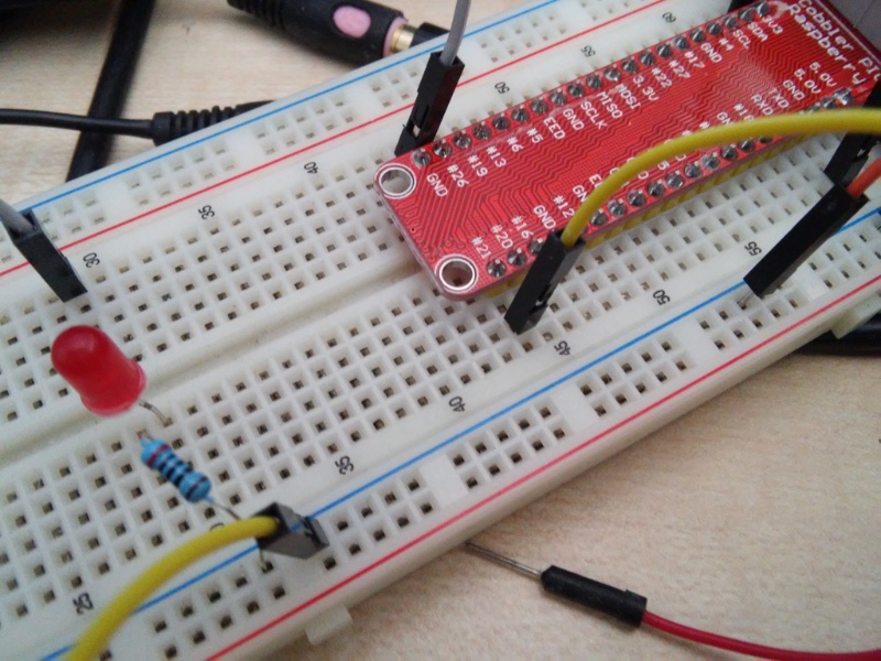 现在,将 LED 连接到物理引脚 40,也就是 BCM 21。请记住:LED 的短腿(负极,称为阴极)必须连接到带有 330 欧姆电阻的树莓派的 GND 引脚, 并且长腿(阳极)到物理引脚 40。