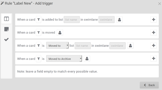 Wekan 的独到之处在于它的内置规则。虽然其他的看板软件支持 邮件更新 emailing updates ,但 Wekan 允许用户自行设定触发器,其触发条件可以是卡片变动、清单变动或标签变动等等。