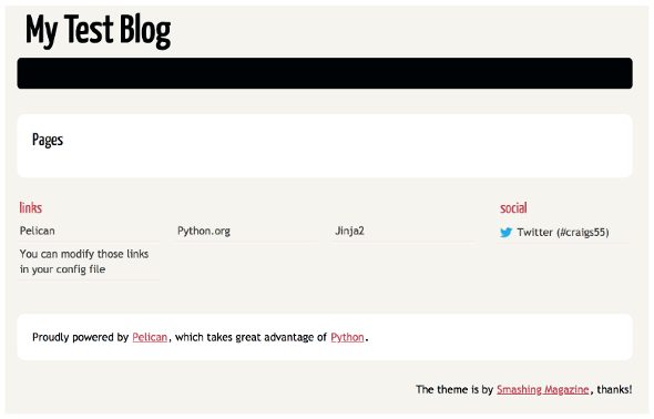 你可以在右侧看到 Twitter 链接,左侧有 Pelican、Python 和 Jinja 的一些链接。(Jinja 是 Pelican 可以使用的一种很棒的模板语言。你可以在 Jinja 的文档中了解更多相关信息。)