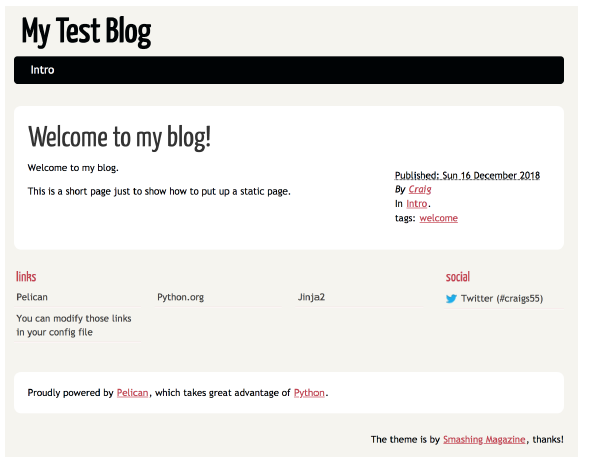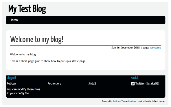 元数据(例如日期和标签)会自动添加到页面中。此外,Pelican 会自动检测到 intro 栏目,并将该部分添加到顶部导航中。