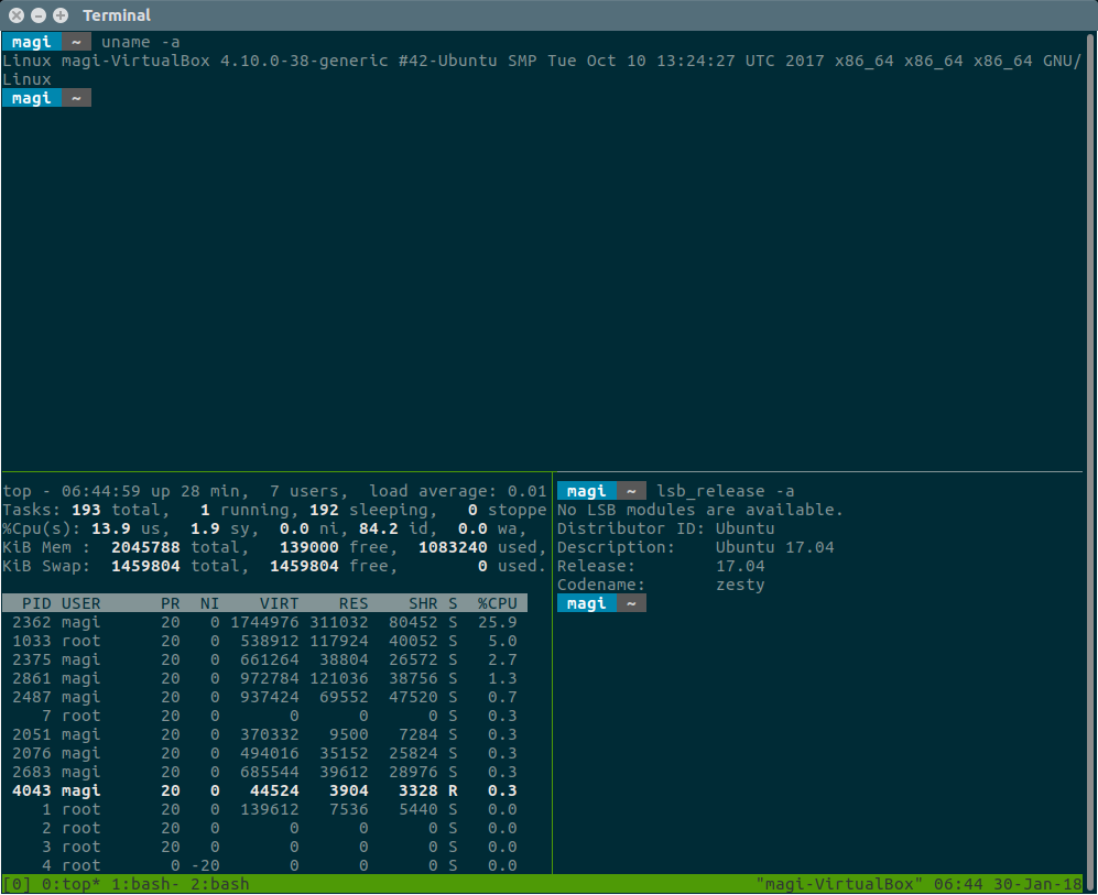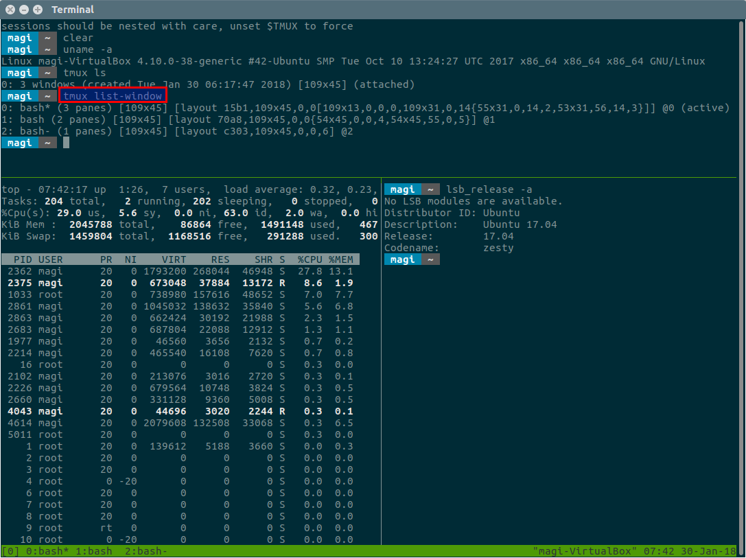 我有两个窗口,第一个窗口有三个窗格,其中包含操作系统版本信息,top 命令输出和内核信息。