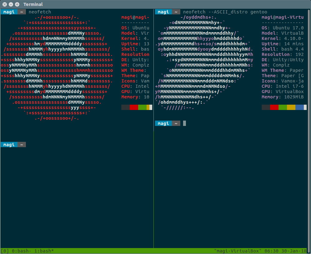 第二个窗口有两个窗格,其中包含 Linux 发行版 logo 信息。使用以下命令执行操作: