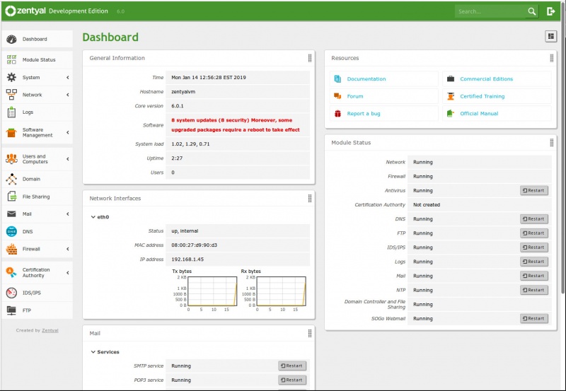 向 Zentyal 服务器添加新组件只需要打开仪表板,单击“软件管理” -> “Zentyal 组件”,选择要添加的组件,然后单击安装。Zentyal 可能会遇到的一个问题是,它提供不了与 Nethserver 和 ClearOS 一样多的插件。但它提供的服务,则做得非常好。