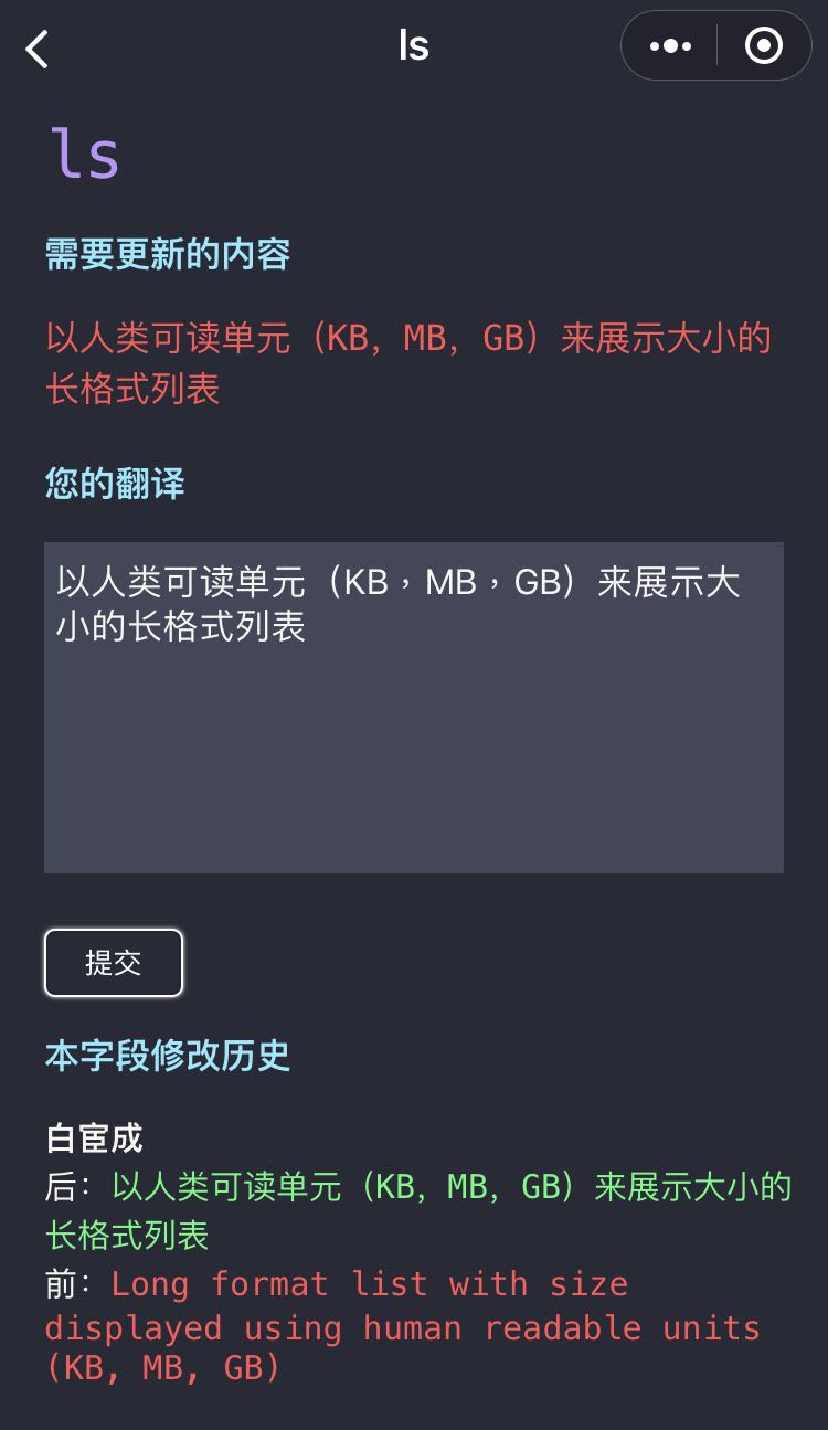 下方还列出了历次翻译的历史,所以你的贡献是所有人都看得到的 —— 切勿胡乱提交。输入翻译提交之后,会返回该命令页面,你可以下拉该页面强制刷新,即可看到翻译效果。