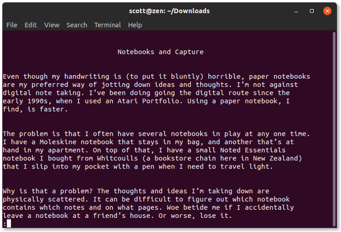 与 Antiword 一样,odt2txt 将文档转换为文本并在终端窗口中显示。和 Antiword 一样,它不会对文档进行分页。但是,你也可以使用以下命令将 odt2txt 的输出管道传输到 less 或 more 这样的实用程序中: