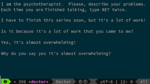 在 Emacs 中,输入 M-x doctor 来启动 Eliza。对于像我这样有 Vim 背景的人可能不知道这是什么意思,只需要按下 escape,输入 x 然后输入 doctor。然后,向它倾述所有假日的烦恼吧。