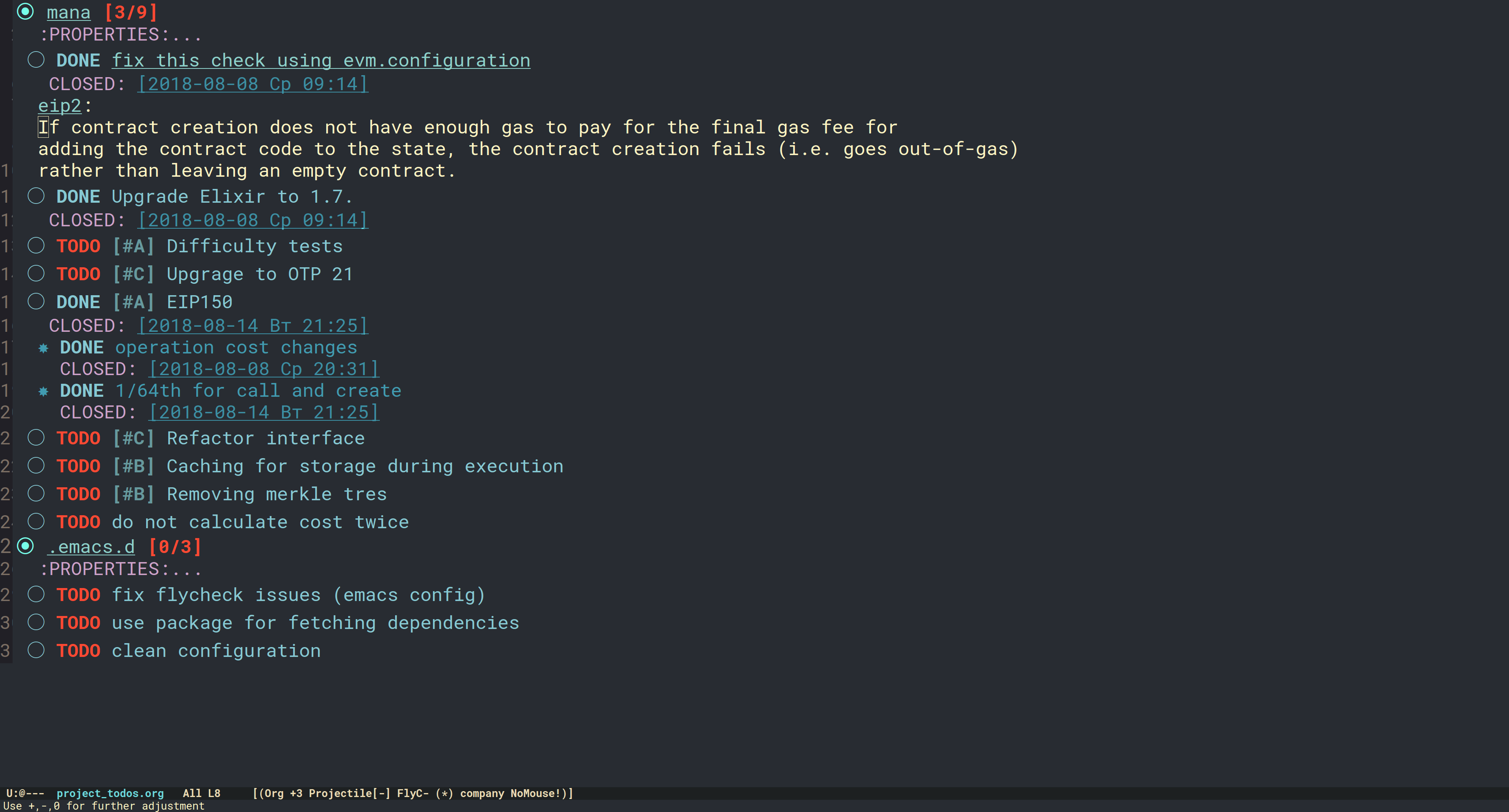 我在工作时时常会发现一些能够改进或修复的事情。我并不会在代码文件中留下 TODO 注释 (坏味道),相反我使用 org-projectile 来在另一个文件中记录一个 TODO 事项,并留下一个快捷方式。下面是一个该文件的例子: