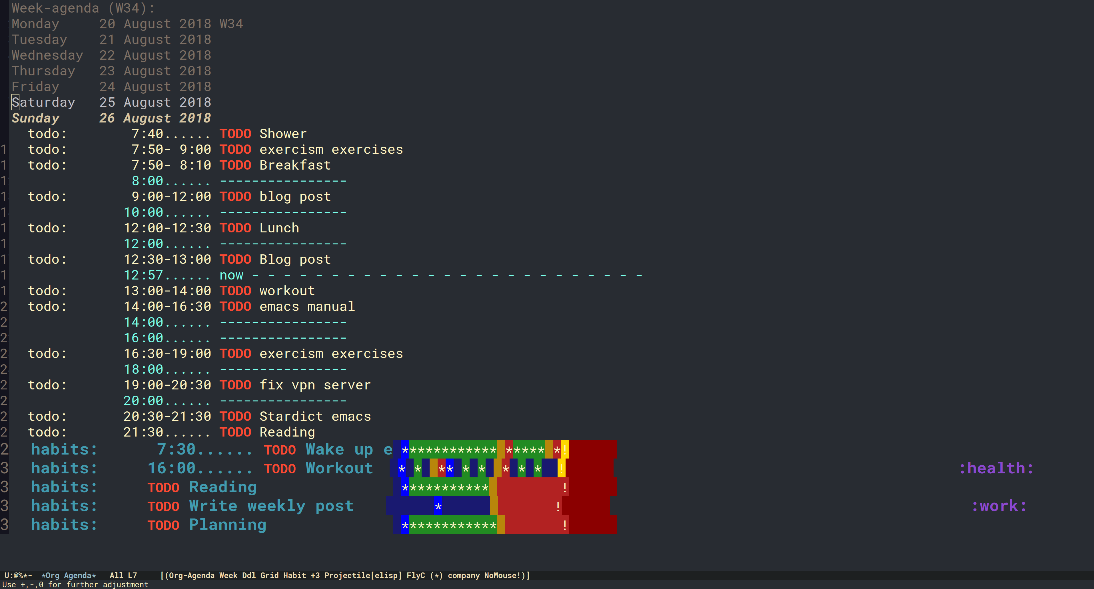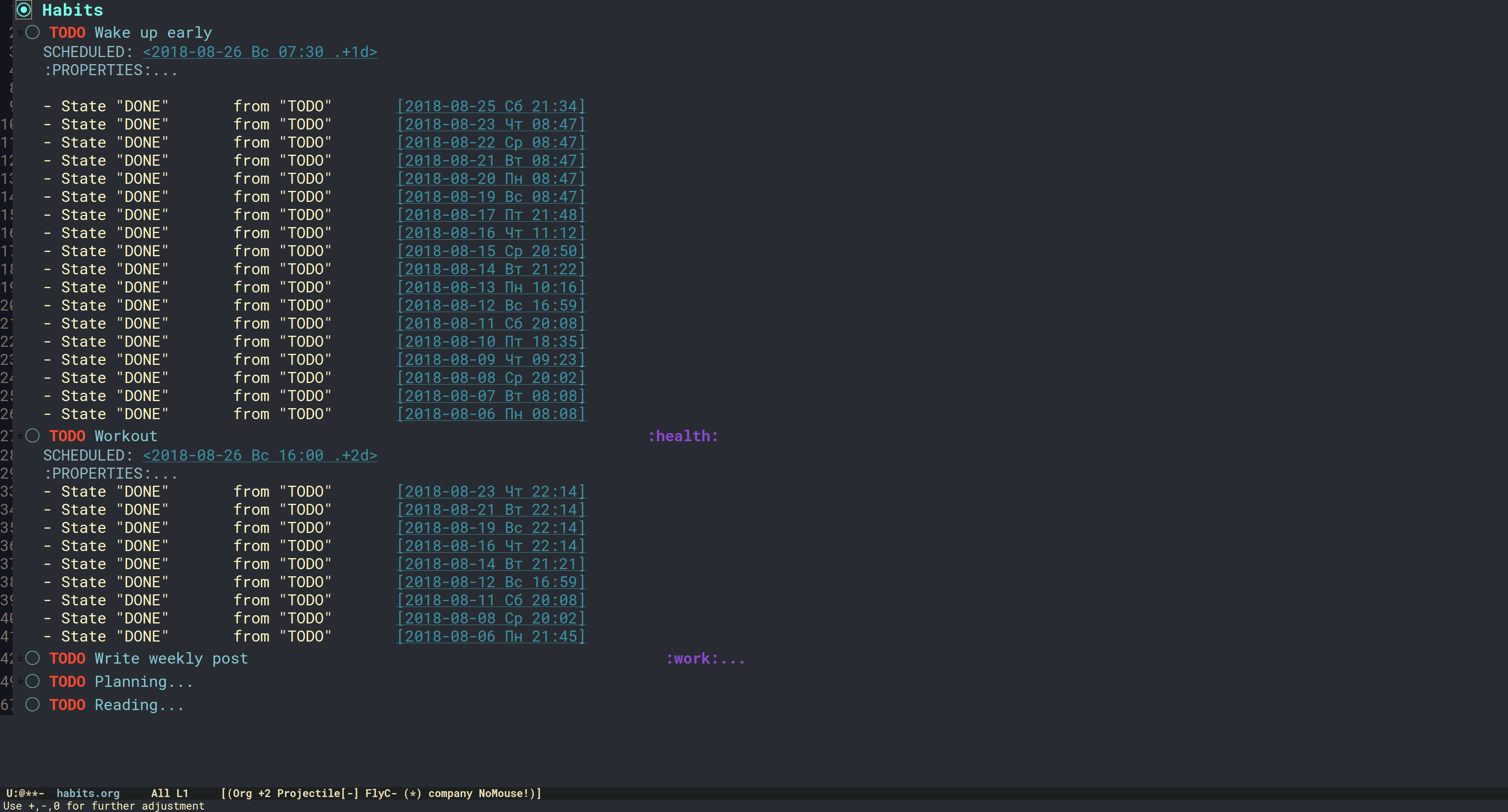 根据 Org 模式的文档,Org 能够跟踪一种特殊的代办事情,称为 “习惯”。当我想养成新的习惯时,我会将该功能与日常规划功能一起连用: