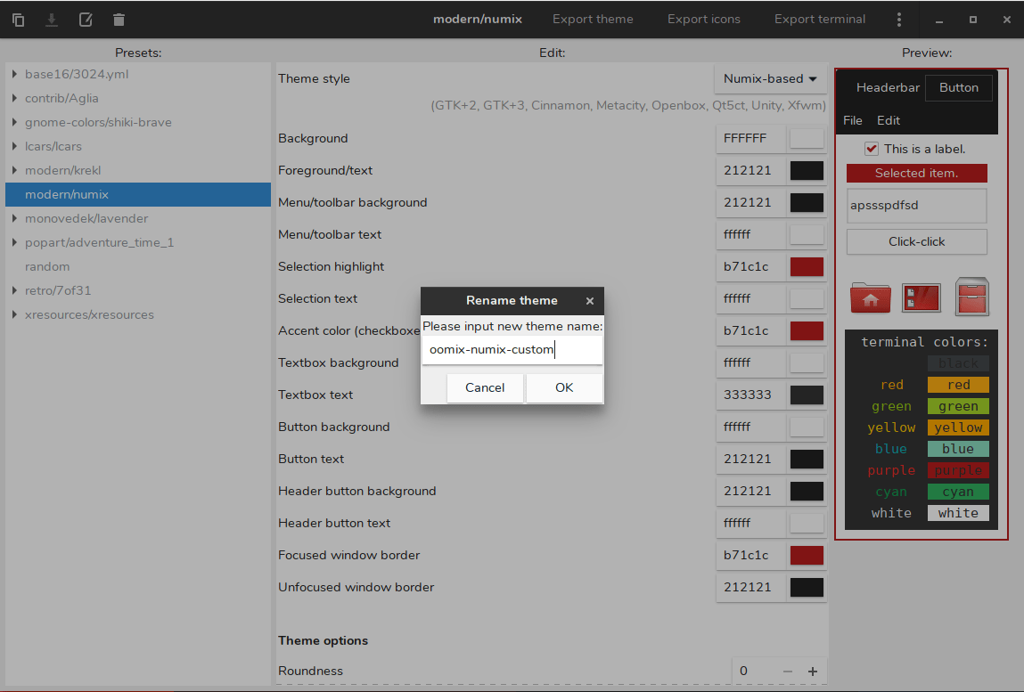 Oomox 是一个图形应用,可以完全使用自己的颜色、图标和终端风格自定义和创建自己的 GTK 主题。它自带几个预设,你可以在 Numix、Arc 或 Materia 主题样式上创建自己的 GTK 主题。