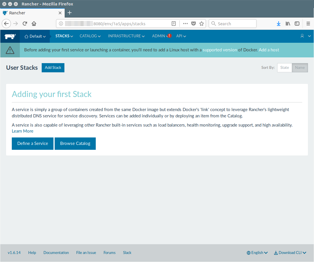 浏览器输入 http://hostname:8080http://server_ip:8080 去访问 rancher GUI.