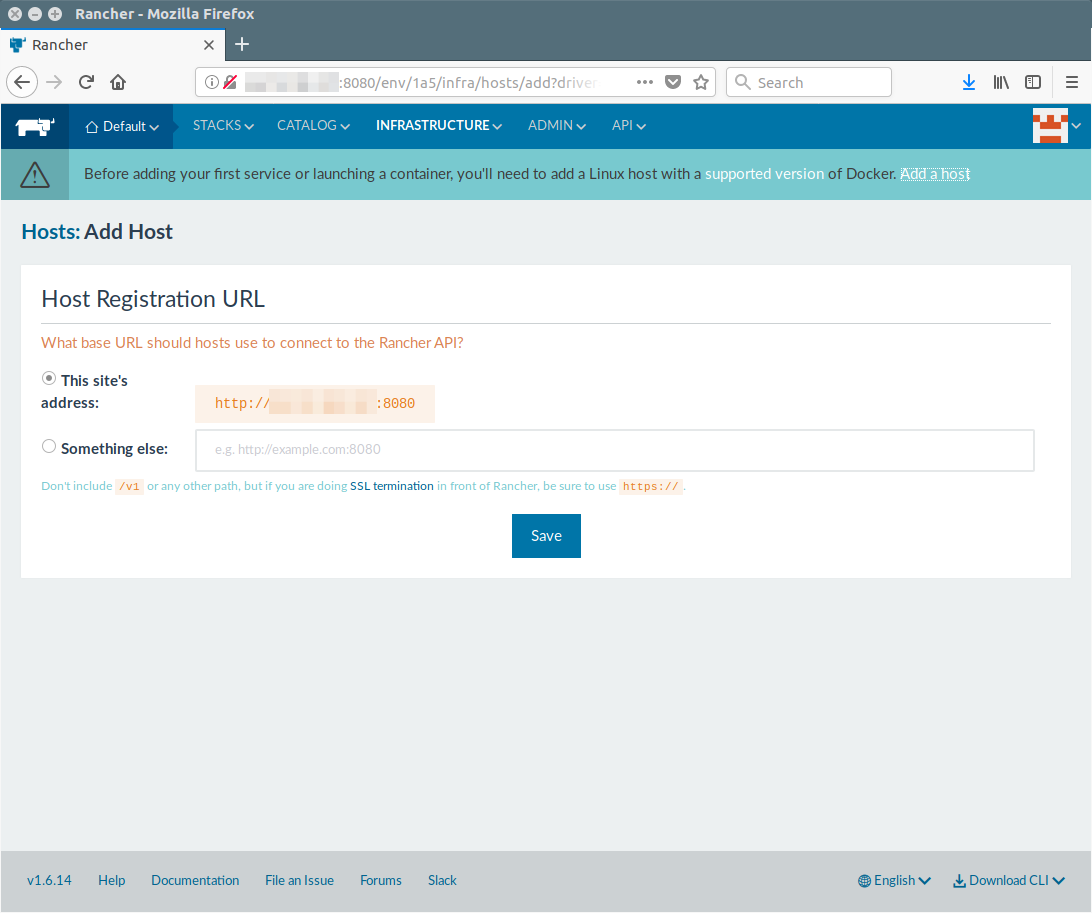 接下来,点击主菜单下面的 “Add a Host” 链接或者点击主菜单上的 “INFRASTRUCTURE » Add Hosts”,点击 “Save” 按钮。