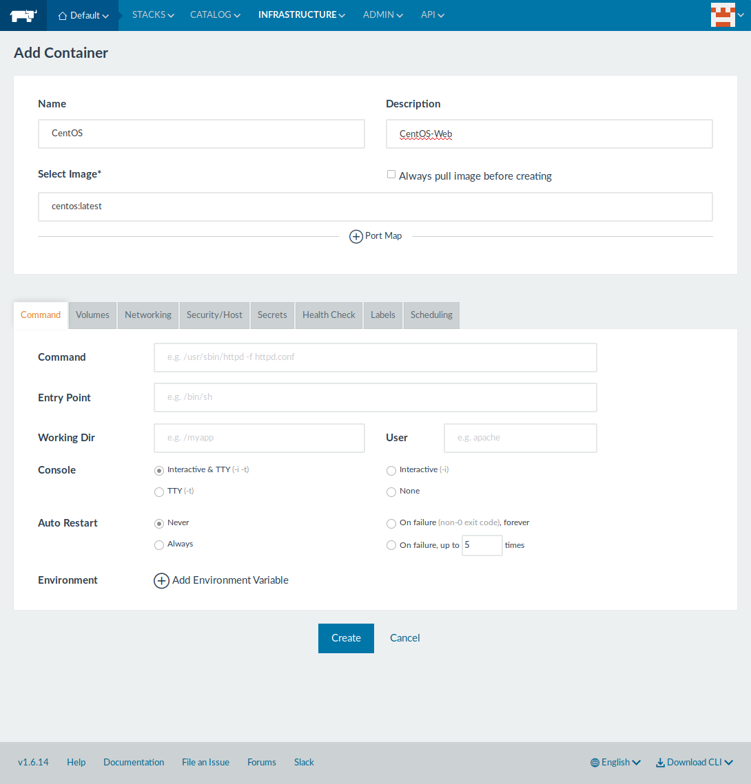 点击 “Infrastructure » Containers » Add Container” 然后输入每个你需要的信息。为了测试,我将创建一个 latest 标签的 CentOS 容器。