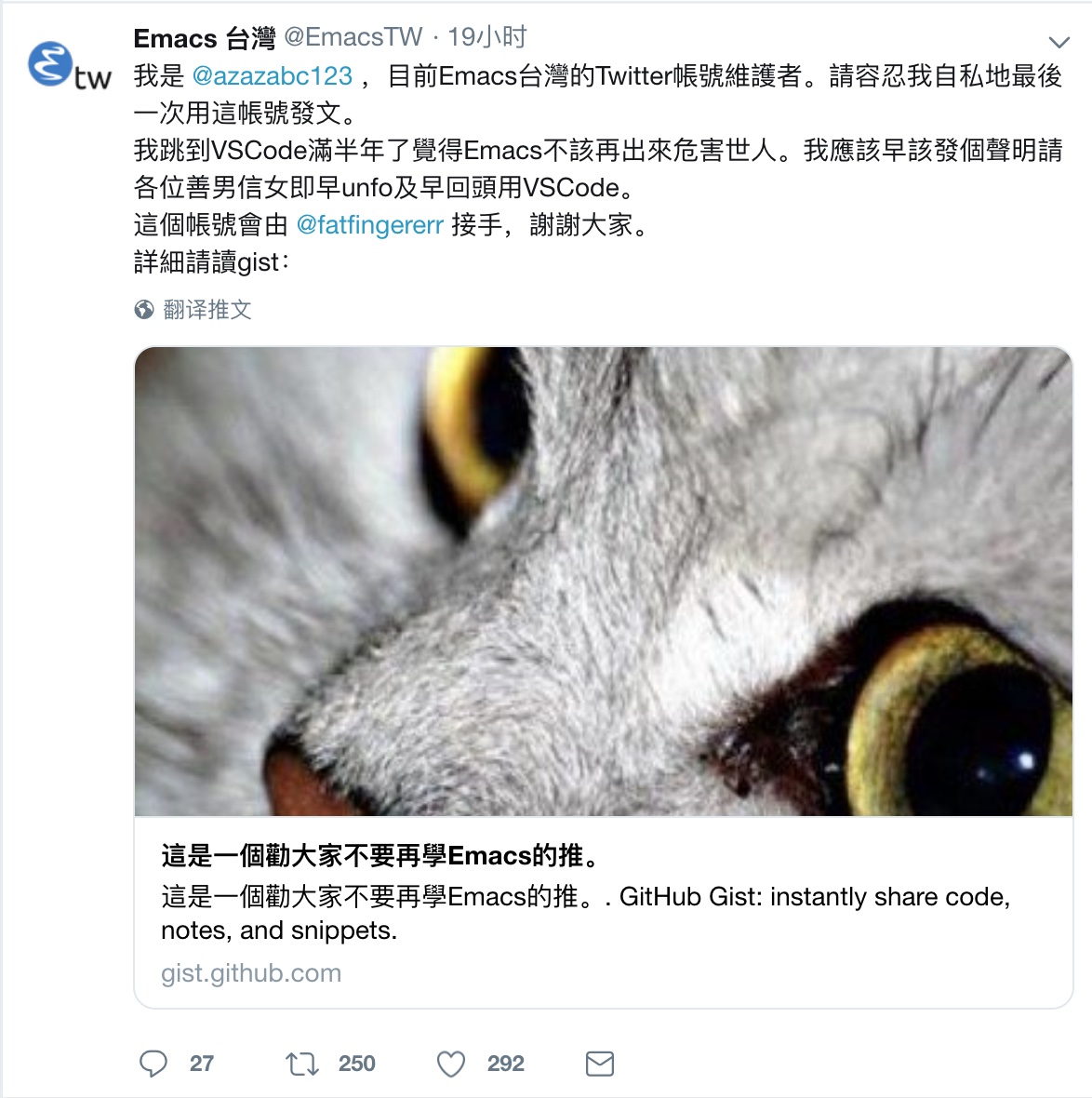 抛开 Emacs 和 VScode 的孰优孰劣不谈,就该推特维护者本身的行为来说,这是一种非常不妥的行为,这让 Emacs TW 社群蒙羞于整个技术社群。这种公器私用毫无疑问是背叛了整个社群,作为社群对外窗口的维护者,发布一条与本社群背道而驰的内容难免会让人觉得不妥。而且,这种行为使得对于 Emacs 的背叛行为从个人行为上升到了群体行为,Emacs TW 中的其他人是否同意这样的行为,还不甚明了——但笔者对该社团的管理能力和未来的前途不报什么期望。