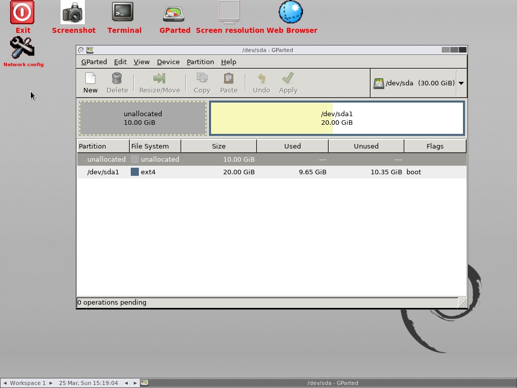 分区从 30GB 缩小到 20GB 已经成功。也显示 10GB 未分配的磁盘空间。