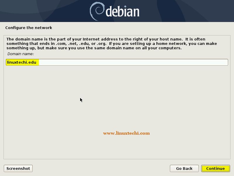 设置适合于你的环境的主机名,然后在 “Continue” 上单击,就我而言, 我指定主机名为 “debian10-buster”。