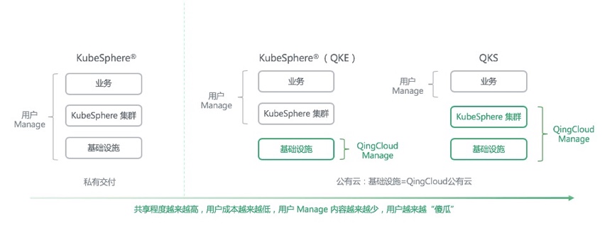 开源的 KubeSphere 与云平台是完全解耦的,这意味着 KubeSphere 可以运行于任何公有云基础设施之上,而当 KubeSphere 根植于青云QingCloud 自身所提供的基础设施时,就出现了 QKE。