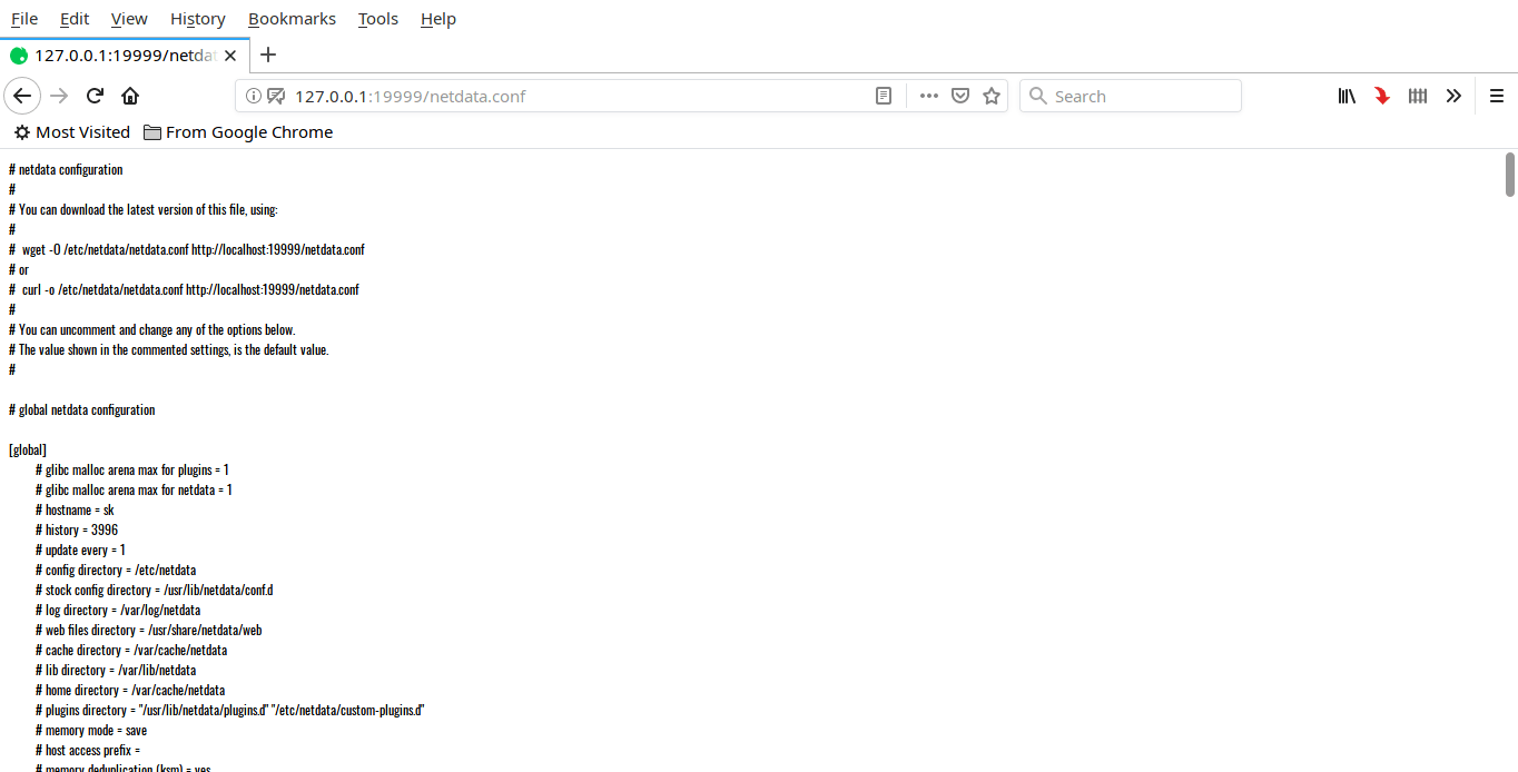 你可以随时打开 http://localhost:19999/netdata.conf 来下载和/或查看 NetData 默认配置文件。